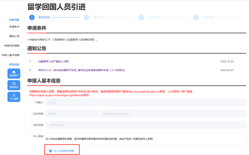 进入事项具体页面,阅读“申请条件”、“温馨提示”、“申报材料清单”等信息,并勾选“本人已阅读并同意”,单击【下一步】。